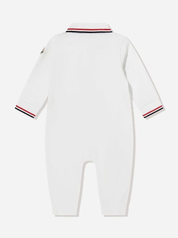 Moncler Enfant baby boys polo romper in ivory. Made from a cotton blend with added elastane, it has a turtleneck and a three-button fastening. Striped trim adds contrast, while the iconic felted logo provides a signature Moncler finish.