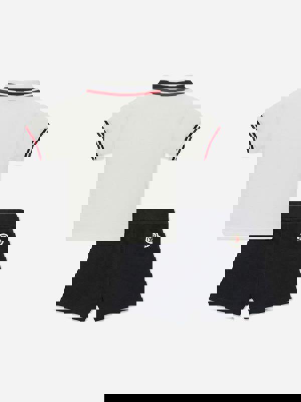 This Moncler Enfant set includes a baby boys polo shirt and matching shorts in white. The polo shirt carries the Moncler logo for a recognisable branded finish. Presented as a coordinated two-piece outfit, it offers a clean, simple look that works as a complete set.