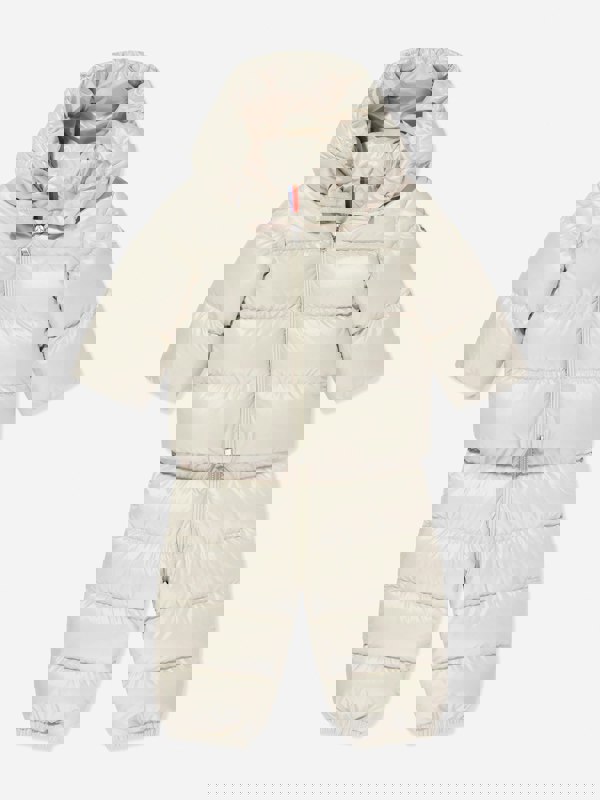This Moncler Enfant baby down padded snowsuit in beige comes as a two-piece set with a puffer jacket and matching overalls. Made in Armenia, both pieces use recycled polyester for the exterior and recycled polyester for the lining, with recycled nylon lining also specified. The jacket includes an adjustable hood with teddy bear ears, a zip closure and elastic cuffs, plus pockets secured with snap button closures.
