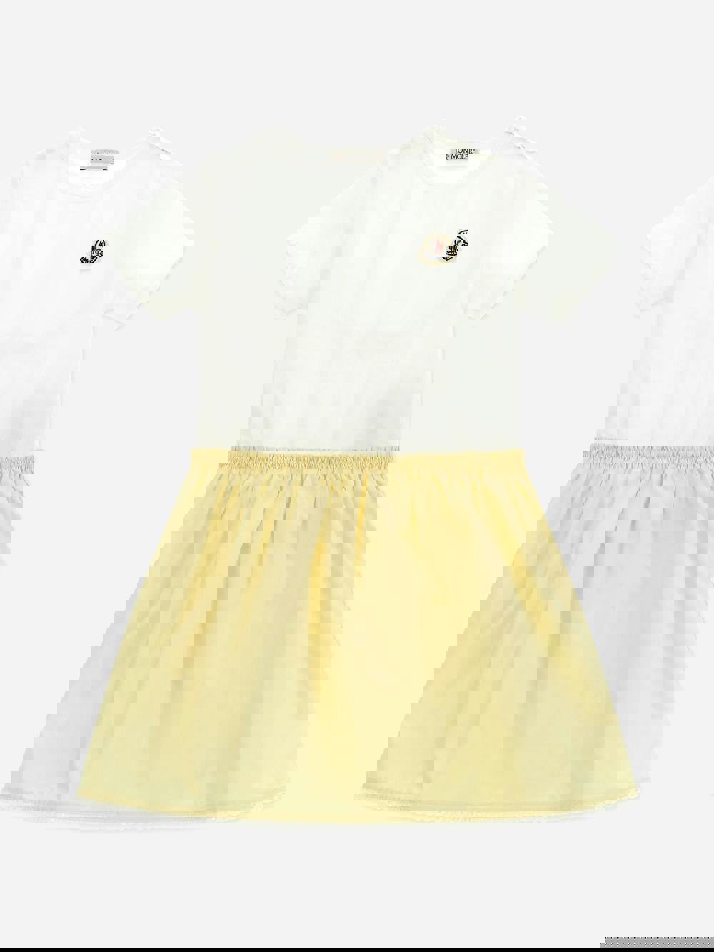 Moncler Enfant baby girls cotton logo dress in yellow from the SS2026 collection. Made from cotton, it combines a bright plain colour with prominent Moncler logo branding.