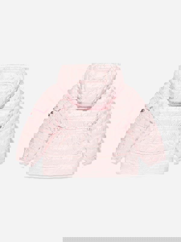 This Moncler Enfant baby girls jacket comes in pink with tiered down padding and a hood. The design includes side pockets and a utilitarian front patch pocket positioned on the side. An embroidered brand tag adds a signature finish.