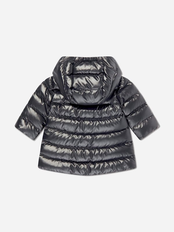 This Moncler Enfant baby girls long coat comes in navy with a padded, tiered construction and a hood. Side pockets and a press-stud fastening keep the finish practical and clean, while silver-tone hardware adds a subtle contrast. An embroidered Moncler badge completes the look.