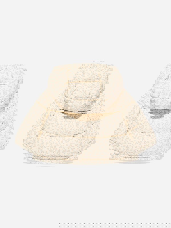 Moncler Enfant Tessa jacket in beige with a leopard print finish and tiered padded sections. The design includes a hood, long sleeves and side pockets, finished with a Moncler embroidered badge. Press-stud fastening secures the front, while elasticated cuffs and hem complete the silhouette.