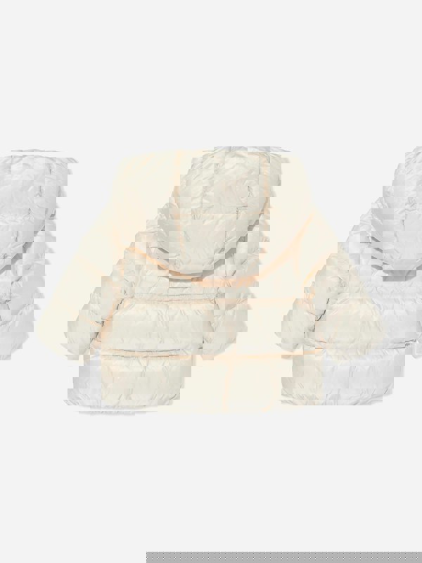 This Moncler Enfant Natas puffer jacket for baby girls comes in beige with tiered padding in white goose down. A hybrid construction combines polyamide/nylon with faux fur for a textured finish. The hooded silhouette fastens with a zip and includes press-stud side pockets for a clean, practical look.