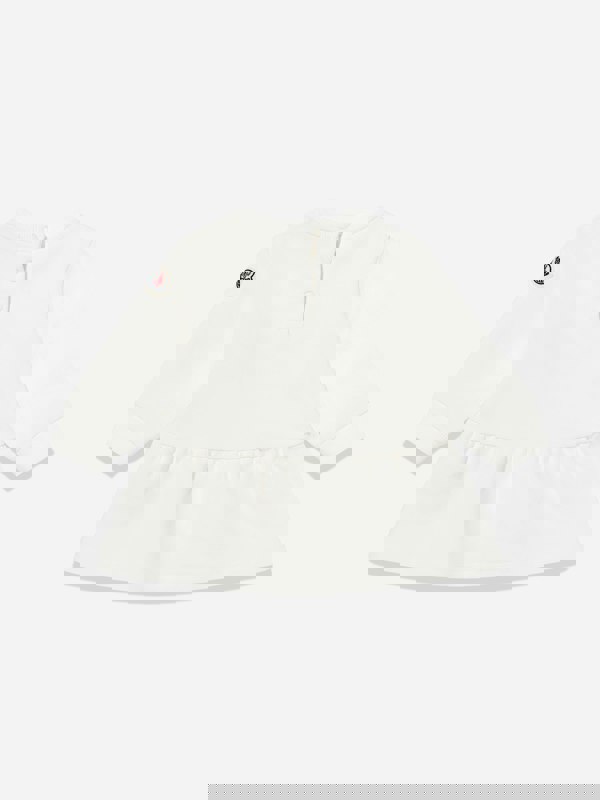 This ivory sweater dress from Moncler Enfant combines a soft, plush texture with a printed heart motif. Crafted in Turkey from stretch cotton fleece, it has a crew neck and long sleeves for a clean, simple finish. A flared skirt adds shape, while ribbed cuffs bring subtle structure to the sleeves.
