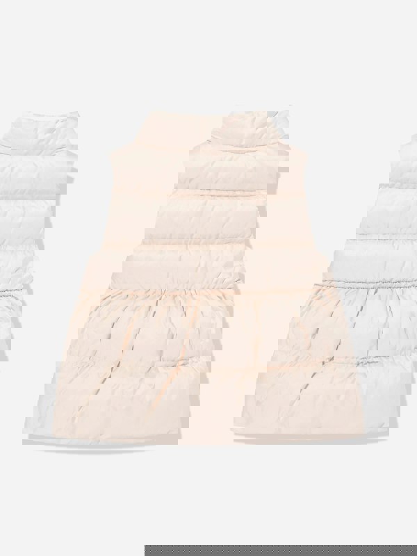 This pink down padded gilet from Moncler Enfant adds an extra layer for baby girls. It uses recycled Longue Saison with a water-repellent main fabric, finished with a nylon lining and down-filled padding. A stand collar includes a chin protection flap, while the front zip closure keeps the silhouette clean and easy to fasten.