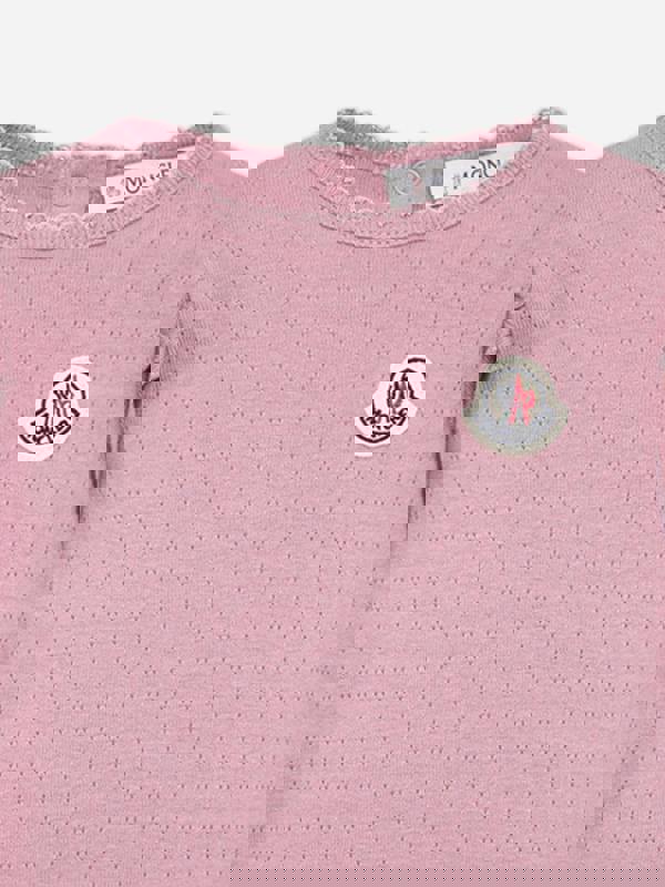 Moncler Enfant baby girls long sleeve logo T-shirt in pink from the SS2026 collection. This long-sleeved top is finished with an iconic Moncler logo detail and comes in a pink colourway.
