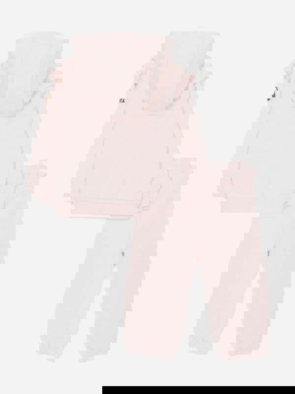 The hoodie fastens with a zip and has ruffled shoulders, plus ribbed cuffs and hem. The trousers have an elasticated waistband and ruffled ankles. Branding includes an embroidered logo on the chest and a logo patch applied on the sleeve.