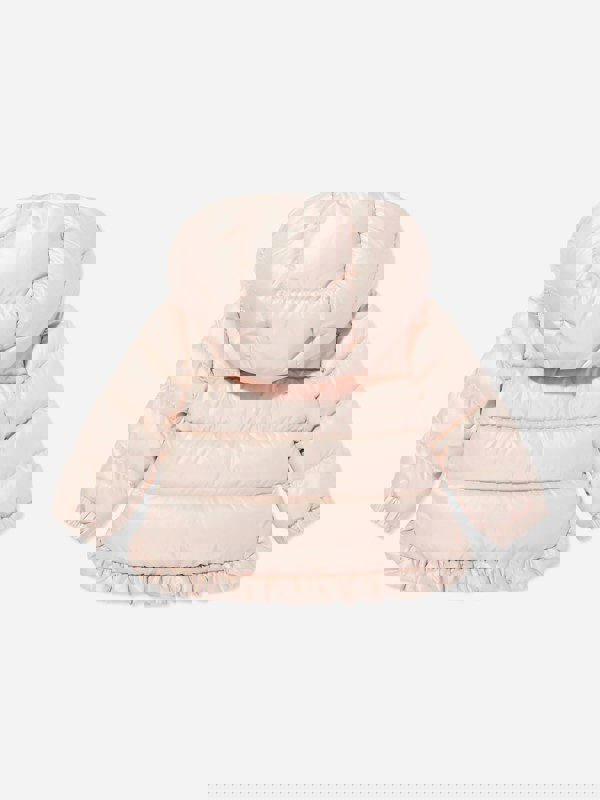 The Moncler Enfant Tazui hooded jacket in pink combines a flared cut with ruffled detailing for a distinctive finish. Made in Moldova, the exterior is crafted from recycled polyester and lined in cotton jersey. Down-filled padding provides insulation, with additional polyester padding at the detail areas.