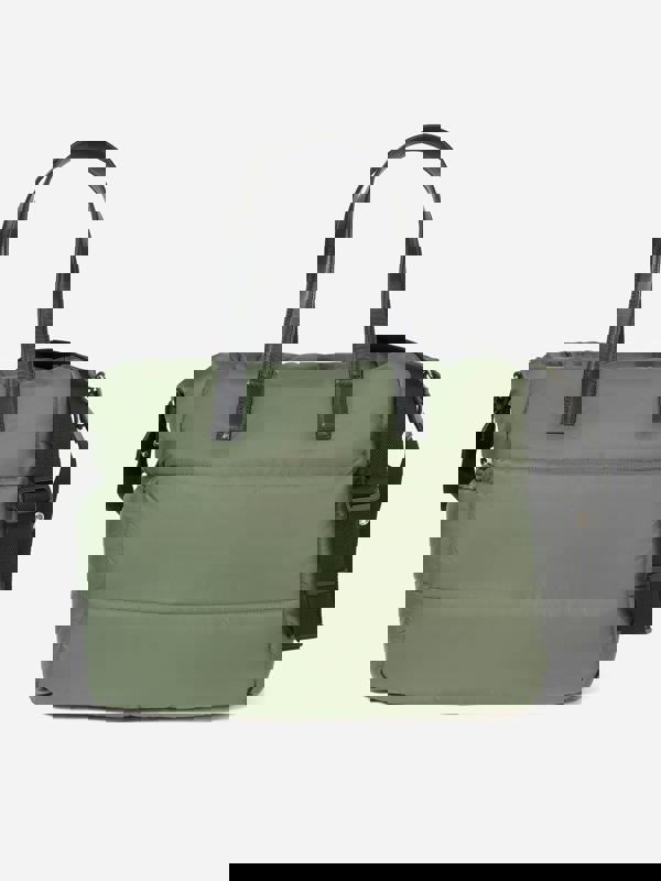 Finished with leather-trimmed edges and pockets, this tote includes an adjustable shoulder strap with a snap button, designed to attach easily to a stroller. A zip closure helps keep contents secure, while the included changing mat in terrycloth and nylon adds convenience for changes on the go.