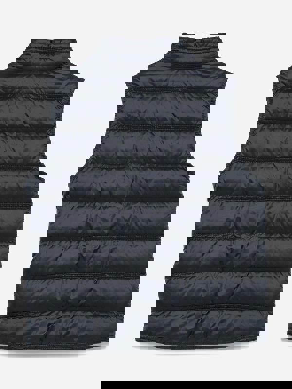 Moncler Enfant Gui gilet for boys in navy, made from 100% polyamide with down padding and a tiered padded structure. A felted Moncler logo adds a branded finish, while the sleeveless cut and mock neck keep the silhouette clean and easy to layer.