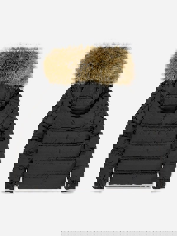 This boys’ New Byrone down padded jacket from Moncler Enfant comes in black with a short silhouette and a water-repellent rainwear outer. It has a nylon lining and down-filled padding, with a hood lined in rainwear and finished with a detachable synthetic fabric trim. A zip closure runs through the front, supported by zipped pockets for essentials.