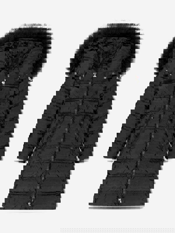 This Moncler Enfant Abelle long coat for girls comes in black with tiered goose down padding. A detachable hood adds versatility, finished with a shearling trim. The front closes with a zip fastening, supported by press-stud fastenings, and the long sleeves are completed with elasticated cuffs.
