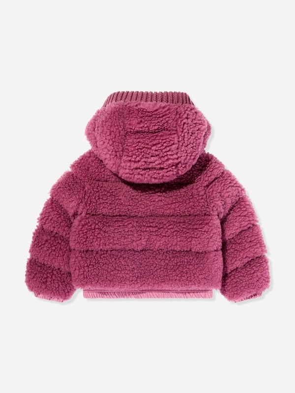 Moncler Enfant Adalbertas down padded jacket in pink with a padded construction and a teddy-effect fleece outer. A hood and brioche stitch knit collar add texture, while the felted logo patch provides a recognisable brand finish. The jacket fastens with a zip and includes snap-button pockets, with elasticated cuffs and hem for a secure outline.