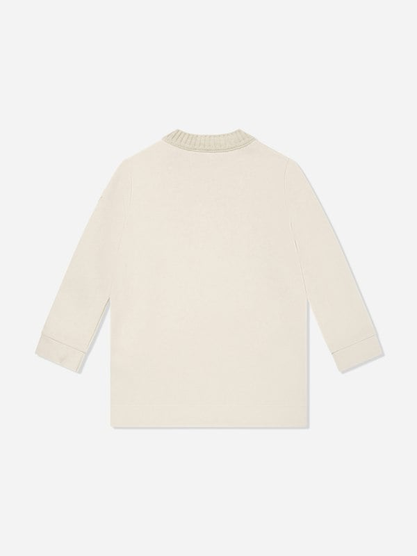 This Moncler Enfant sweater dress in ivory combines a soft cotton fleece base with a rib knit crew neck. Long sleeves and a snap button closure on the shoulder keep the design practical and easy to wear, while the branded finish adds a clear Moncler Enfant identity.