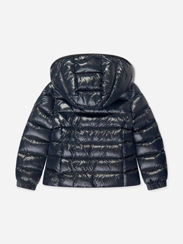 Moncler Enfant Bady jacket in navy with a padded puffer construction and a high collar. An embroidered logo patch sits on the sleeve, paired with contrasting hems and a straight hem finish. The front closes with a zip and button fastening, and the side pockets secure with zip fastenings.