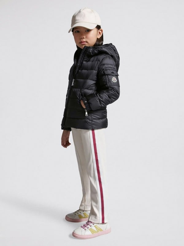 Moncler Enfant girls down padded Gles jacket in black. A lightweight layer that works across seasons and suits a wide range of outfits. The clean, plain black finish keeps the look simple and versatile, while the down padding adds warmth without extra bulk.