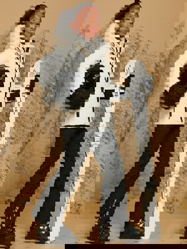 Moncler Enfant Girls Grenoble Down Padded New Guyane Jacket in white. This ski jacket has tiered padding and a ruched back, with black trims and a Grenoble print. A detachable hood with faux fur trim adds a distinctive finish, while side zip pockets provide practical storage.