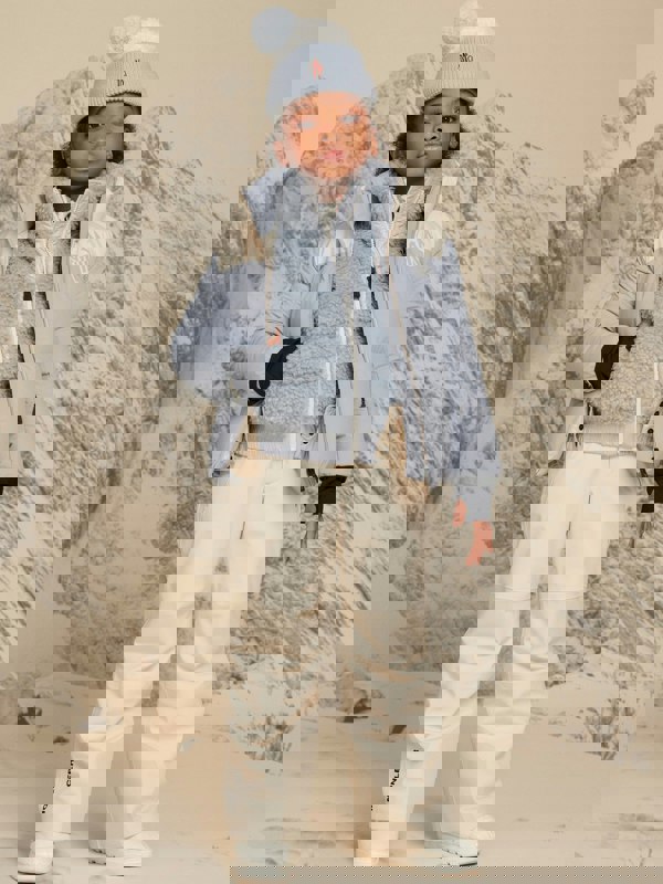 Moncler Enfant Grenoble Stennes ski jacket for girls in blue. Tiered padding and a down padded construction for thermal insulation, with a highly water repellent finish and good breathability. A hood and elasticated cuffs add practical coverage, while the zip fastening and press-stud fastenings secure the front. Branding includes an ‘M’ Grenoble logo and a Moncler print on the back. Multiple pockets complete the design.