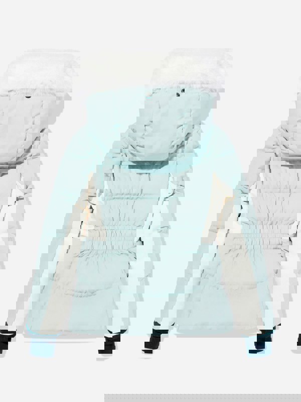 A detachable hood includes a detachable synthetic fabric trim. Water-repellent look zip closures secure the front and pockets, while an inner pocket fastens with hook-and-loop. Practical ski-ready details include a ski pass pocket, an elastic back waistband, an elastic powder skirt with non-slip silicone, and stretch jersey wrist gaiters. A printed logo and a label for writing a child’s name complete the finish. Made in Romania.