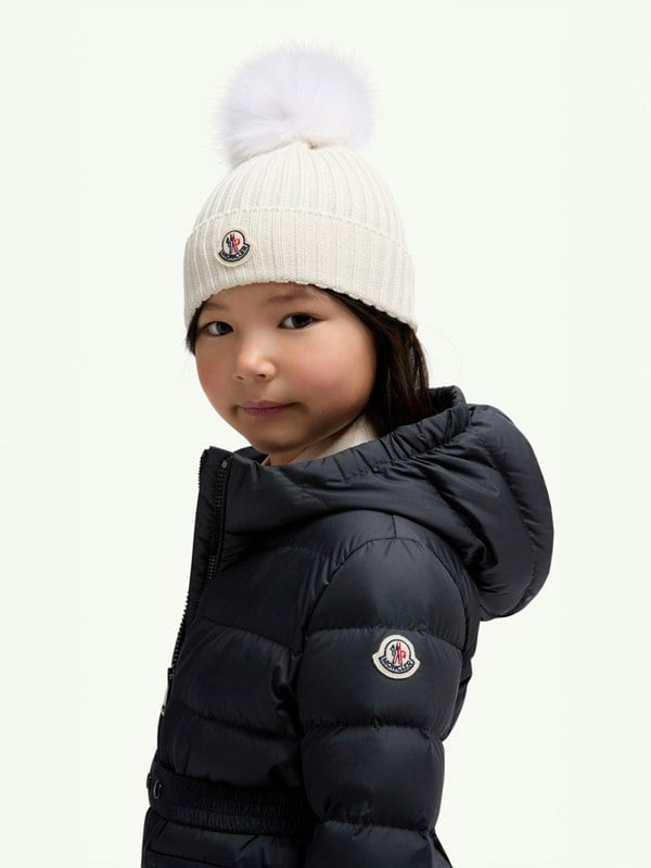This girls’ knitted pom pom hat from Moncler Enfant comes in ivory and is made in Italy. The base fabric uses ultra-fine merino wool, finished in a rib knit with a gauge 7 construction. A synthetic fabric pom pom completes the look.