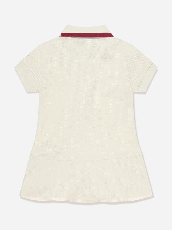 Moncler Enfant girls logo polo dress in ivory. Ribbed cotton blend fabric with ribbed trims and a stripe collar with Moncler print. Branded buttons fasten at the front, and a pleated stripe hem adds contrast. Moncler detailing includes an embroidered tag.