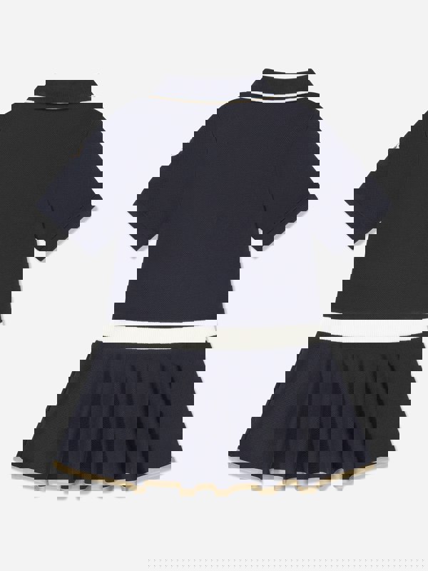 Moncler Enfant girls logo polo dress in navy, made in a cotton blend with a refined combination material finish. The design includes a pointed collar and a snap-button fastening at the front. Short sleeves are finished with ribbed trims, and a ribbed waistband adds structure to the silhouette. Branding details include a logo on the front and an iconic logo patch on the sleeve.