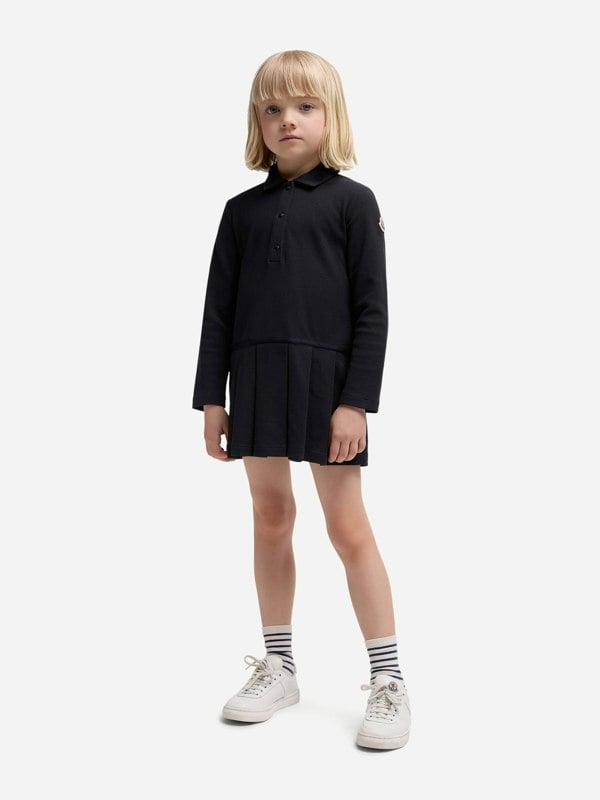 Moncler Enfant girls polo dress in midnight blue and white cotton-blend piqué. The design combines a polo-style top with a pleated skirt and contrasting profiles for a clean, defined finish. An iconic felted logo patch sits on the sleeve, paired with short sleeves and ribbed cuffs.