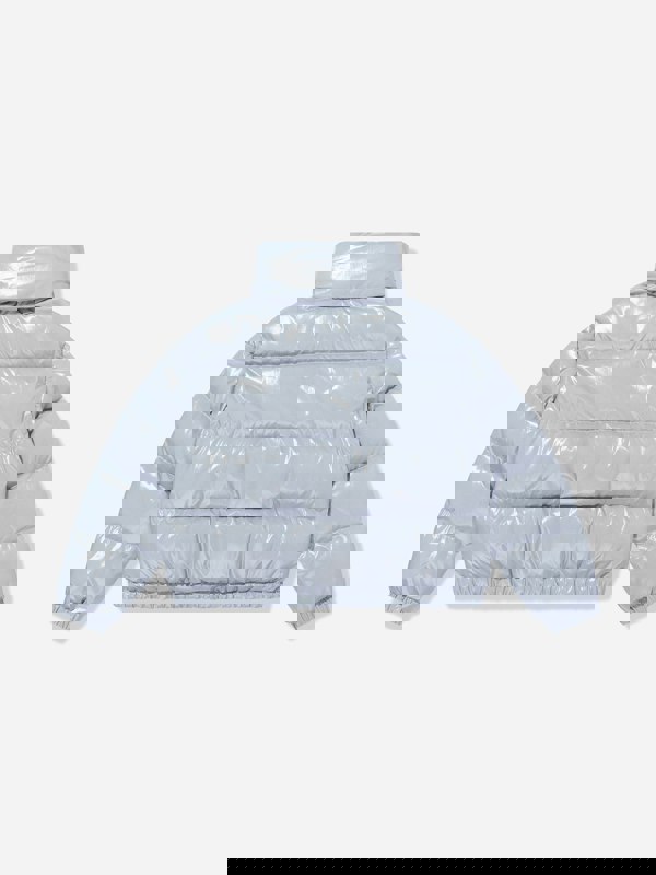 The front closes with a zip and snap buttons. Pockets fasten with snap buttons for a secure hold. Material details include 90% down and 10% feather padding, with additional polyester padding used for the details.