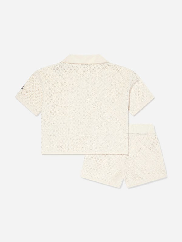 Moncler Enfant girls short set in ivory. The set includes a top and shorts, finished with a printed design.