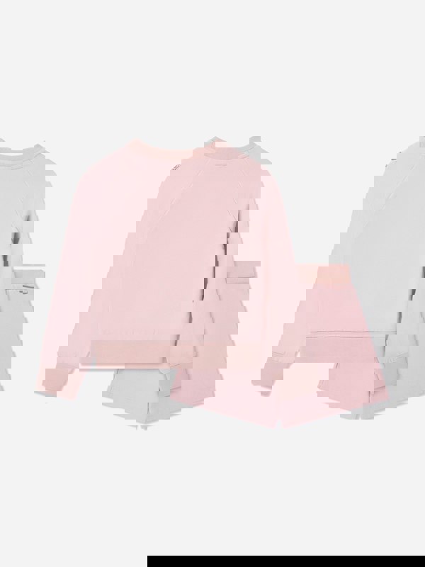 The top is finished with ribbed trims and includes a kangaroo pocket. The shorts have an elasticated waistband and side pockets. Both garments are made from 100% cotton.