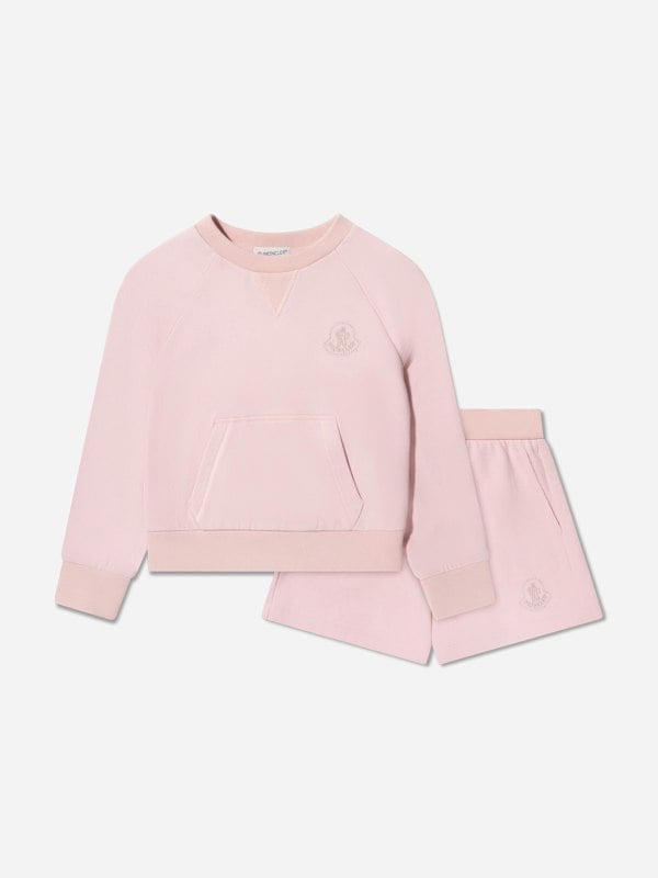 This Moncler Enfant two-piece set for girls comes in pink and includes a knitted sweater and matching shorts. Both pieces carry a Moncler embroidered grey print and a tag, keeping the look consistent across the set.