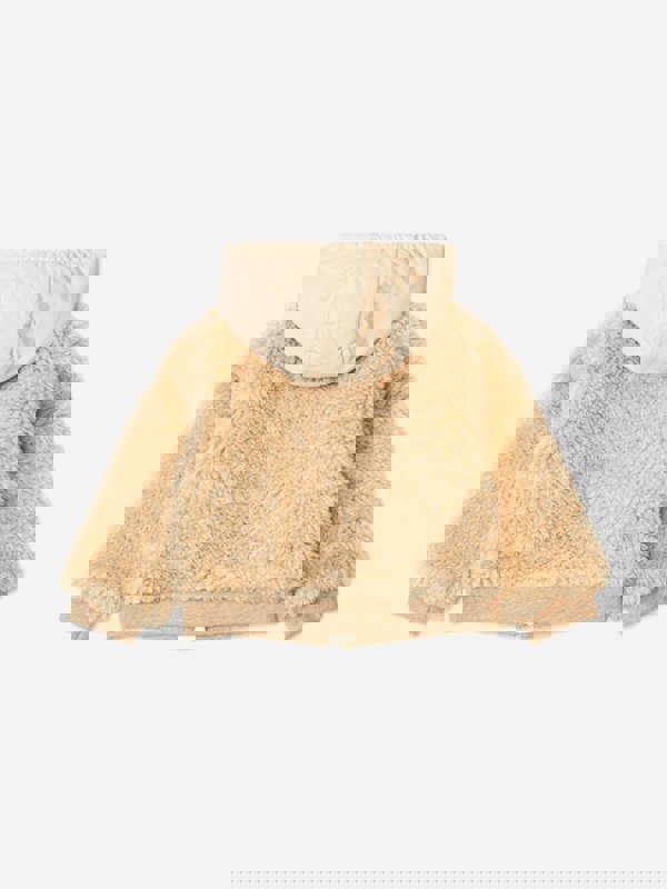This zip-up hoodie from Moncler Enfant is made in Moldova and finished in beige teddy fleece. The base fabric is 100% polyester, with a cotton jersey body lining for a soft internal finish. A hood with polyester lining adds an extra layer, while ribbed cuffs and hem provide a neat, structured edge.