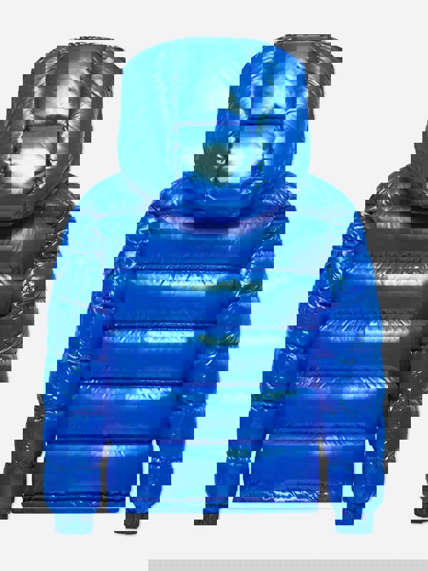 Moncler Enfant reworks the Maya jacket for boys in a blue nylon laqué finish with down padding. The jacket is made in Armenia and lined in nylon laqué, keeping the look consistent inside and out. A detachable hood and stand collar add practical coverage, while the zip front keeps the profile clean.