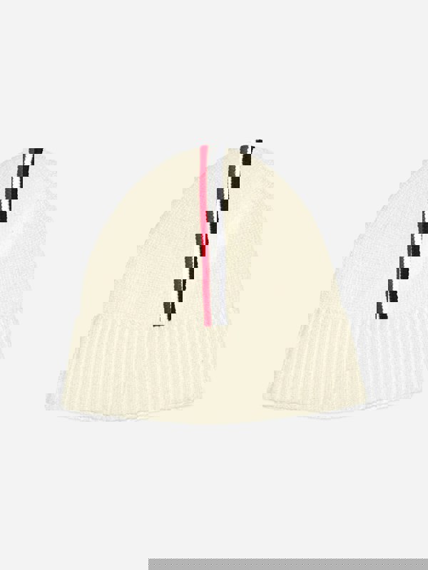 Moncler Enfant logo beanie hat in ivory. Made from 100% cotton, this boys’ hat has a ribbed knit construction with a turn-up brim. Striped detailing adds contrast, while the oval crown keeps the silhouette classic and clean.