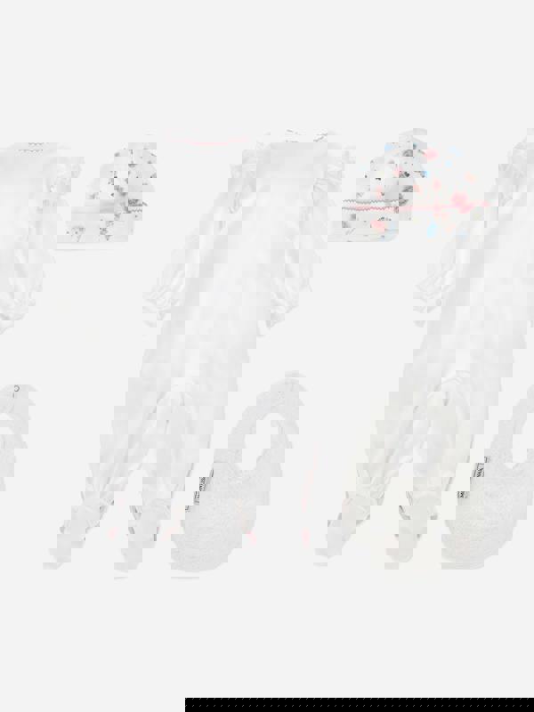 The babygrow fastens with press-studs for easy changing and is finished with frills and elastic cuffs. A matching bib and hat complete the set for a consistent look across each piece.