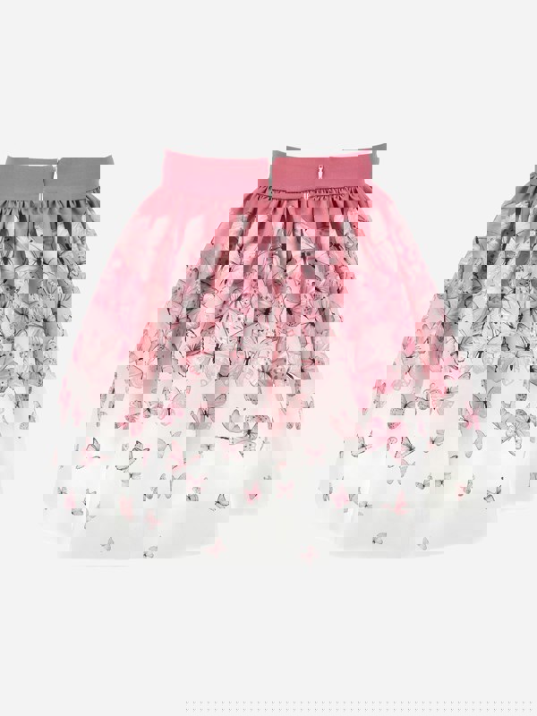 This girls skirt from Monnalisa comes in pink with a Mikado butterfly print. It has a half-wheel line with gathering for added shape, and an elasticated basque with a zip fastening. Made in Italy, it is finished with muslin and tulle lining.