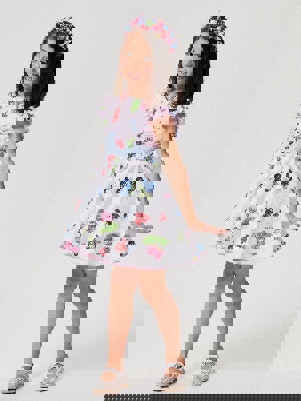 Monnalisa girls fruit print dress in pink, made in Italy for the SS2025 season. The dress has a fruit motif print.