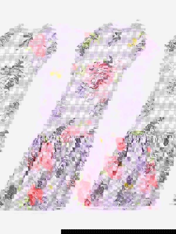 This Monnalisa girls skater dress comes in purple with an all-over checked print and floral details. Short sleeves and a jersey fabric construction keep the look simple and easy to wear.