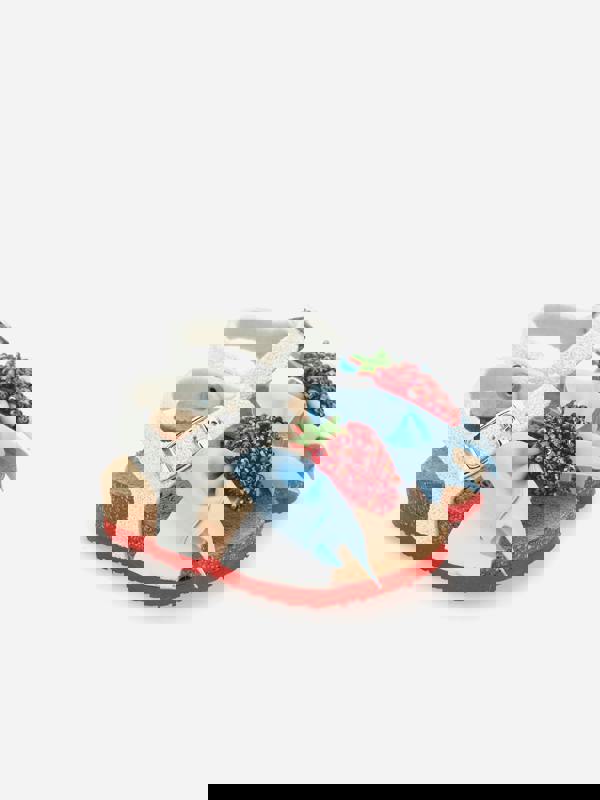 Monnalisa girls sandals in white with a glitter strawberry motif. Made in Italy, this pair brings a playful finish to warm-weather looks with a clean, bright colour and sparkling detailing.
