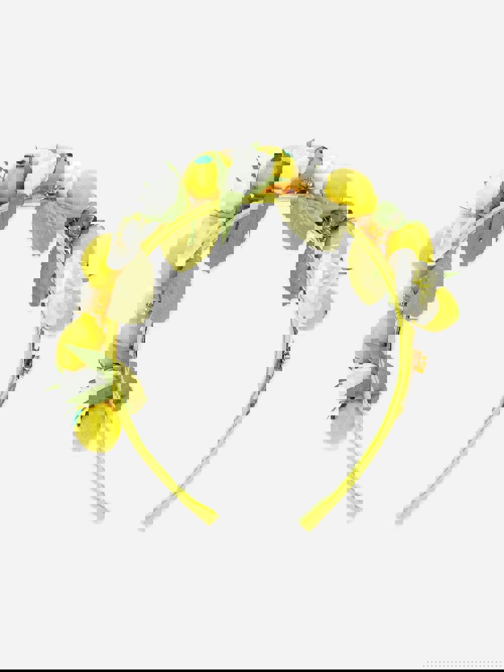 Bring a playful finish to her look with the Monnalisa Girls Lemons Headband in yellow. Designed with Monnalisa’s Italian sensibility and contemporary romance, this headband is detailed with decorative flowers, leaves and lemons for a standout, characterful style. Gold-coloured details add a refined touch, while the ribbon finishing completes the design with a neat, polished look.