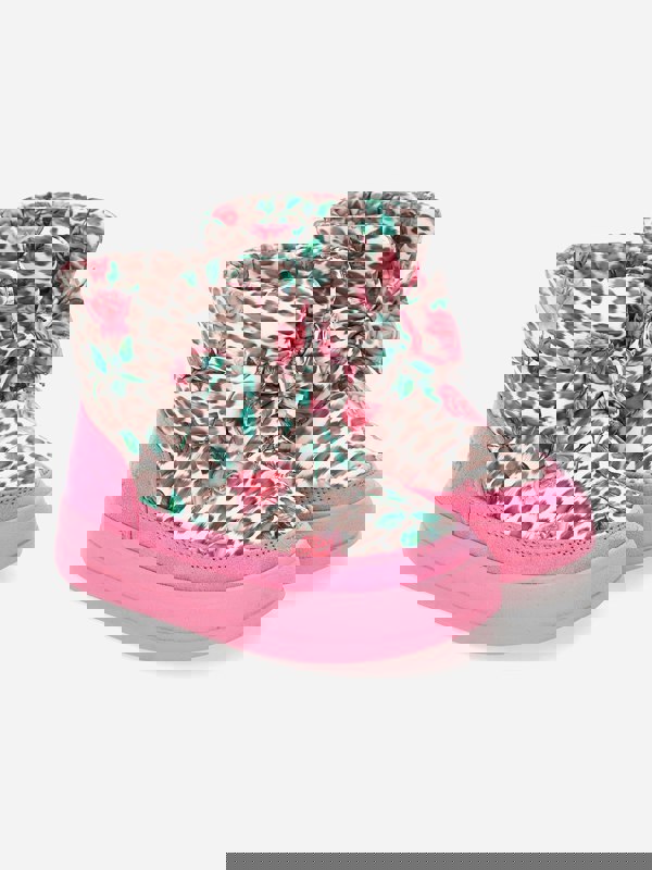 Monnalisa girls’ snow boots in pink with a leopard and rose theme. The upper uses a nylon blend for a snug fit, with decorative bow detailing for a distinctive finish. Monnalisa branding is embroidered on the heels.
