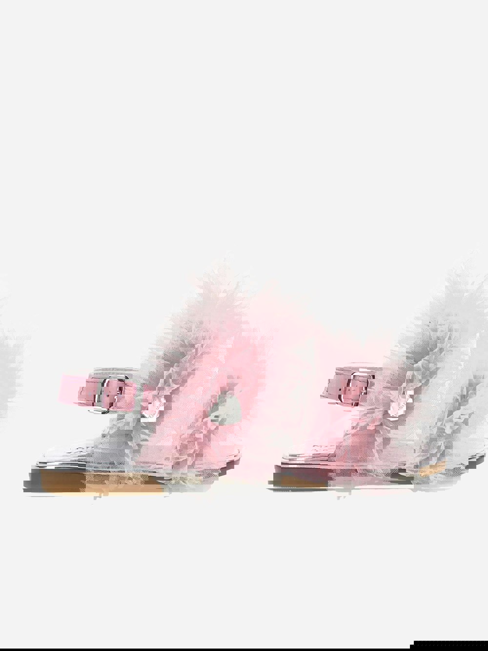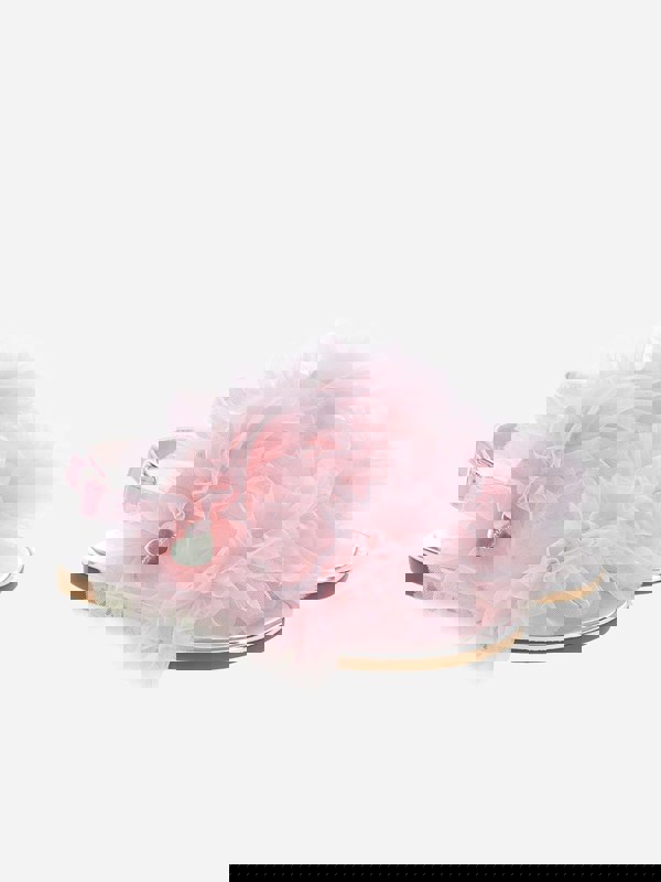 Monnalisa girls’ sandals in pink with ruched detailing and an open toe. The upper has all-over ruffles, finished with a plaque and silver-coloured logo. A leather insole sits above a flat rubber sole, and the side buckle fastening secures the fit.