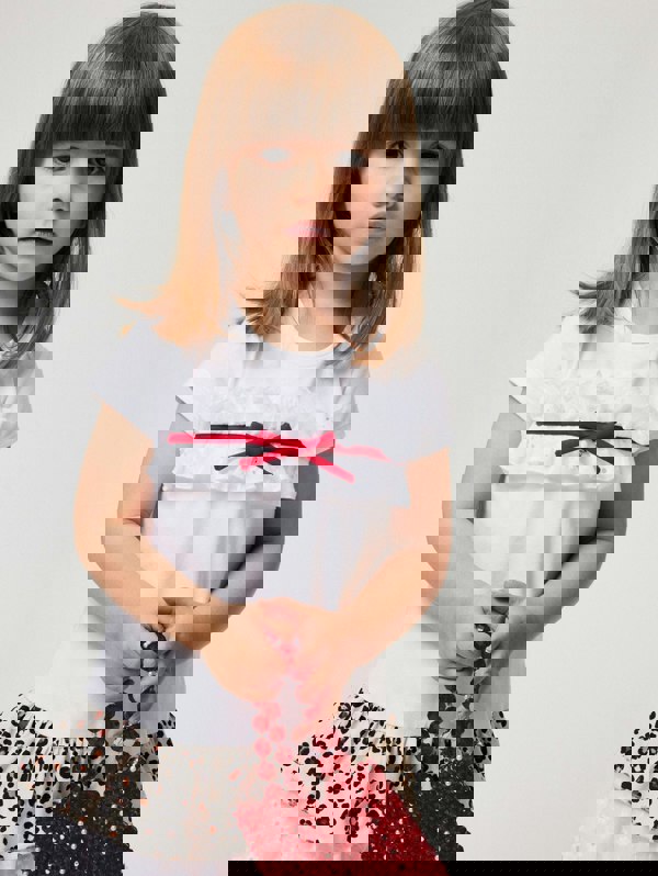 Monnalisa incorporate passion and innovation into their beautifully crafted designs. Woven in stretch cotton jersey. This girls t-shirt dress presents a Sangallo insert and logo ribbon on the yoke. It has a flared line with alternating flounces, lace, and animalier.