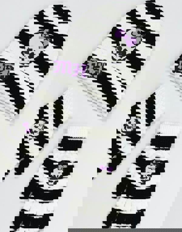 Keep your child warm this winter with the Monster High Girls Black, White, and Purple Striped Beanie and Gloves Set