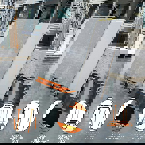 The comfort grip foam handle provides added ease during use, reducing hand fatigue and enhancing control. For added safety and stability, the trolley is equipped with secure non-slip rubber matting that keeps your plasterboard firmly in place. The angled deck design also ensures optimal support and alignment of materials, facilitating easier access and efficient handling of your plasterboard sheets.