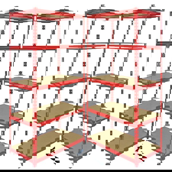 Built from powder-coated steel in a sleek glossy red finish, each shelving unit is as tough as it is stylish. The bolt-less, keyhole design ensures quick and fuss-free assembly — all you'll need is the included rubber mallet. Each bay features five solid MDF shelves with adjustable heights, allowing you to configure your storage exactly the way you want it. The corner unit holds up to 265kg per shelf, while each standard Z-Rax bay can bear a mighty 360kg per shelf (with evenly distributed weight), making this bundle perfect for tools, boxes, parts, stock, or bulky household items.