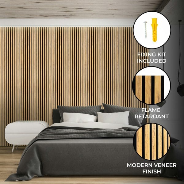 Crafted with precision, the slats are made of durable MDF topped with a high-quality veneer that replicates the warm, timeless appeal of natural oak wood. Each slat is paired with a 9mm thick felt backing that is not only highly effective at reducing noise but also flame retardant for added safety. The individual slats are 27mm wide and 12mm deep, with 13mm spacing, giving a modern, uniform look that complements any décor. The carefully chosen materials ensure both visual appeal and long-lasting performance.