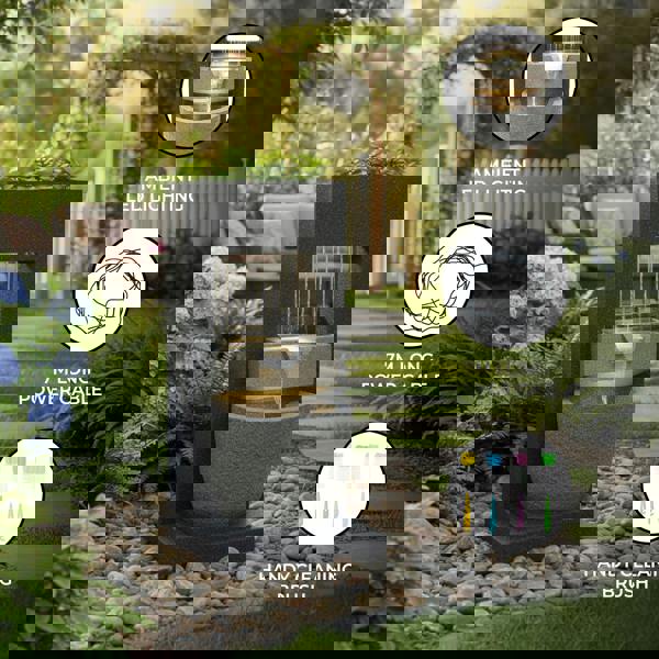 A built-in planting compartment at the top lets you personalise the design with flowers, trailing greenery or seasonal plants, adding colour and softness to the structured form. As evening falls, 2 warm white LED lights illuminate both the upper cascade and lower basin, enhancing the shimmer of flowing water. Crafted from polyresin for a durable yet lightweight finish, it features a built-in electric pump for continuous circulation, an IP44 rating for outdoor use, and a 7m cable to give you flexibility when positioning it. A cleaning brush is included to help keep the feature looking its best.