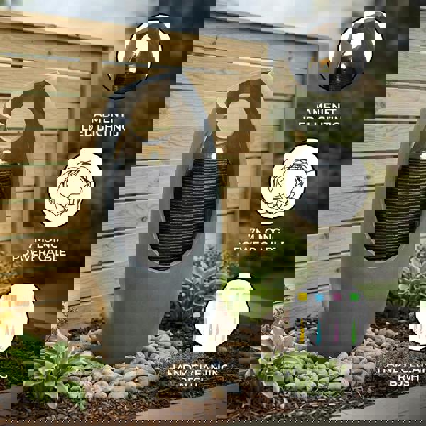 Water gently bubbles from the top and cascades down the textured surface, creating a soft trickling sound. As evening sets in, a warm white LED light positioned at the water source casts a subtle glow across the flowing water, highlighting the ripple effect for an ambient look after dark. Made from durable yet lightweight polyresin, it’s easy to position, while the IP44 rating supports outdoor use. A 7-metre power cable offers flexible placement, and a cleaning brush is included to help keep the water flowing smoothly throughout the seasons.